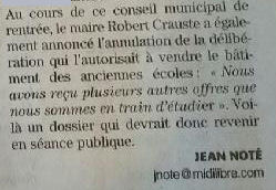 On ne reviendra pas sur les épisodes précédents du feuilleton à rebondissements de la Vente des Anciennes Ecoles ni sur l’annonce furtive de l’annulation de ce projet lors du Conseil Municipal du 22 juillet 2015 mais tout de même, cette décision aurait pu être davantage développée.
